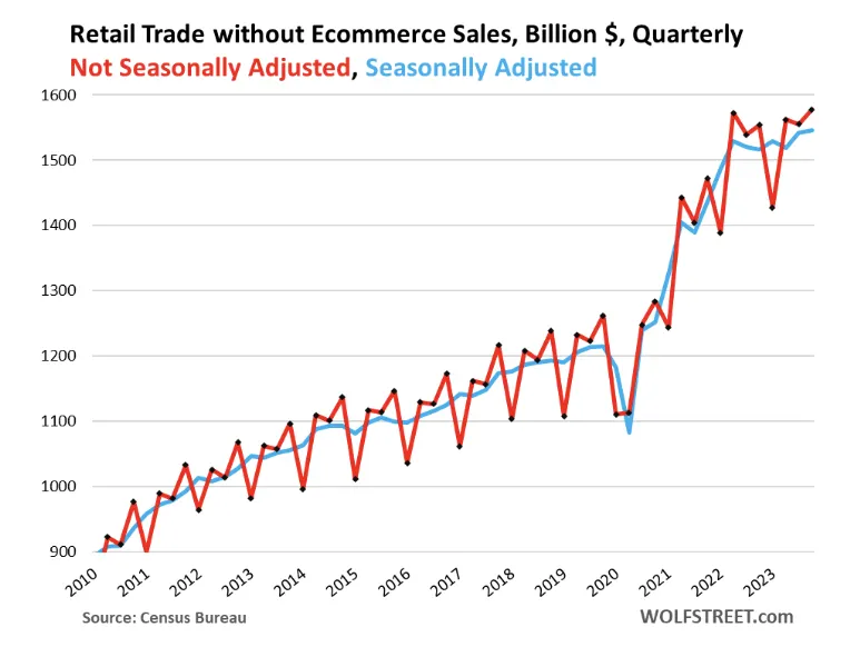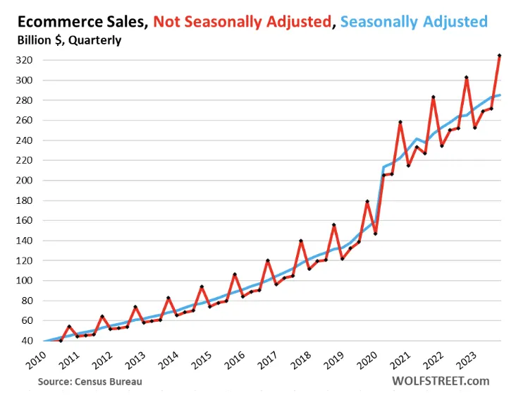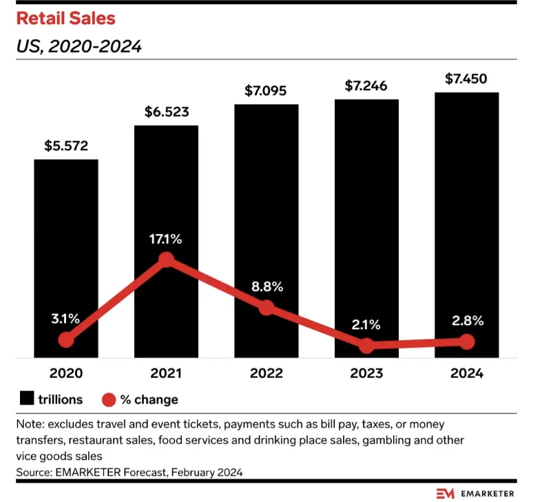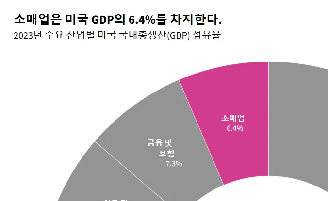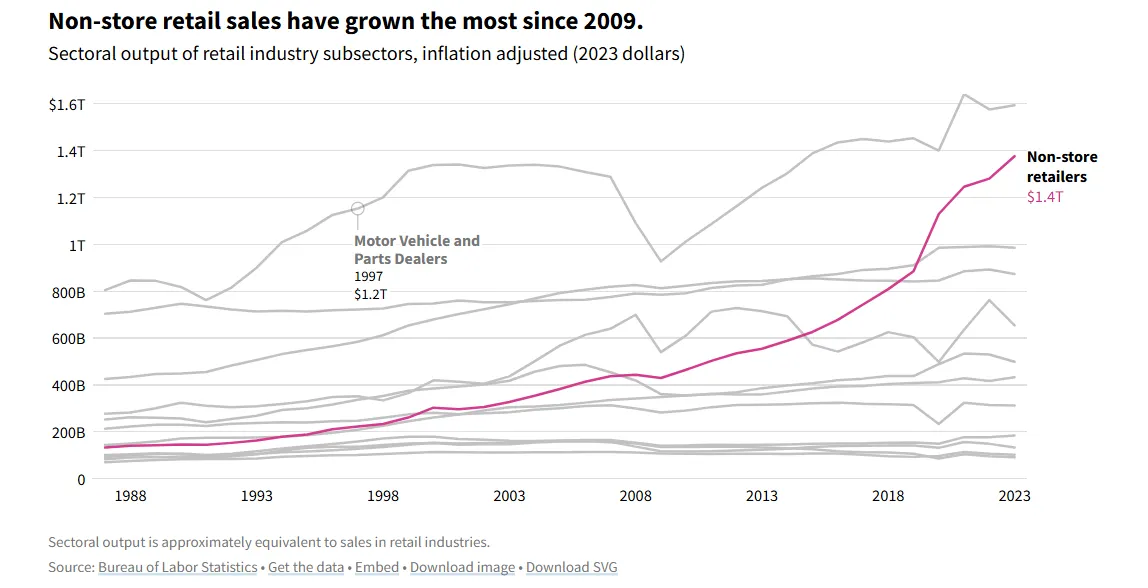 non-store retailers: 2023 매출$1.4T, 오프라인 이외의 매출이 1988년 이후 급속도로 증가 ,2024년 기준 미국 소매업 전체매출은 7조 4500억달러 예상)