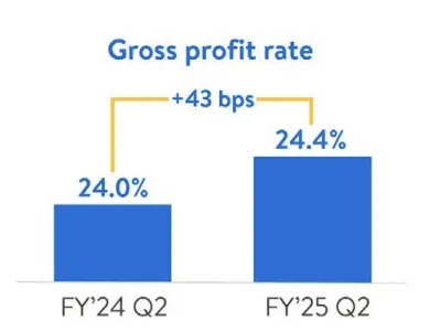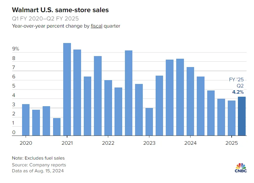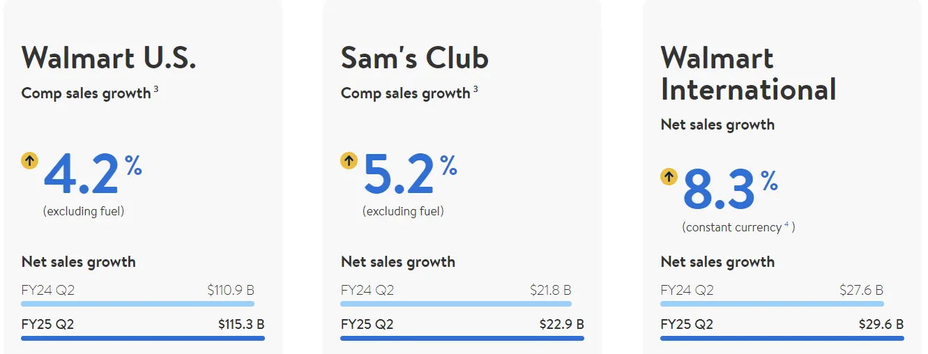 월마트 2025.2분기 실적: 월별 매출액 보기, 전년대비 기존점 신장율 4.2%(셈스클럽 5.2%), 이커머스 신장율 22%. 월마트 신규고객의 %가 GEN A와 밀레리얼로 구성되어 있어 미래가 밝다. 특히 월마트는 년간소득 100,000만달러 이상의 고소득자의 방문을 목표로 새로운 PL BETTER GOODS의 런칭은 이 번분기도 침투율이 증가하였다(0.3%). 중국처럼 이커머스와 중국업체의 치열한 공략에도 불구하고 기존점 신장율(COMP SALES)이 13.8%의 놀라운 성장을 이루었다. 2025년 예측은 2025년 3분기에 월마트는 불변 환율로 통합 순매출이 전년 대비 3.25-4.25% 증가할 것으로 예상. 조정된 EPS는 $0.51 에서 $0.52 사이로 예상.