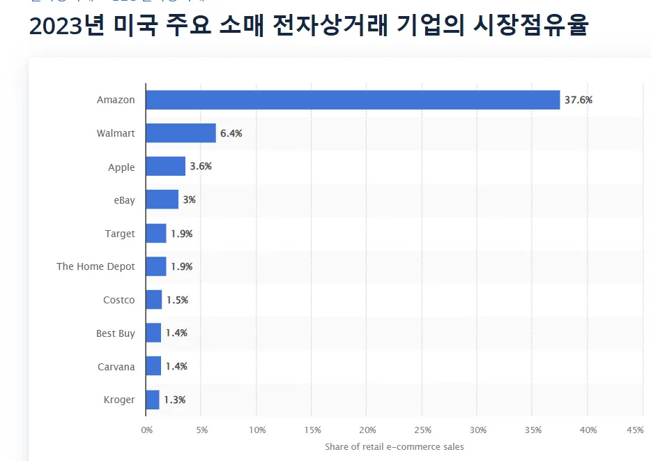 2023년 미국 소매업체 전자상거래 시장 점유율 현황