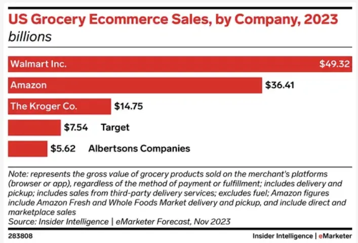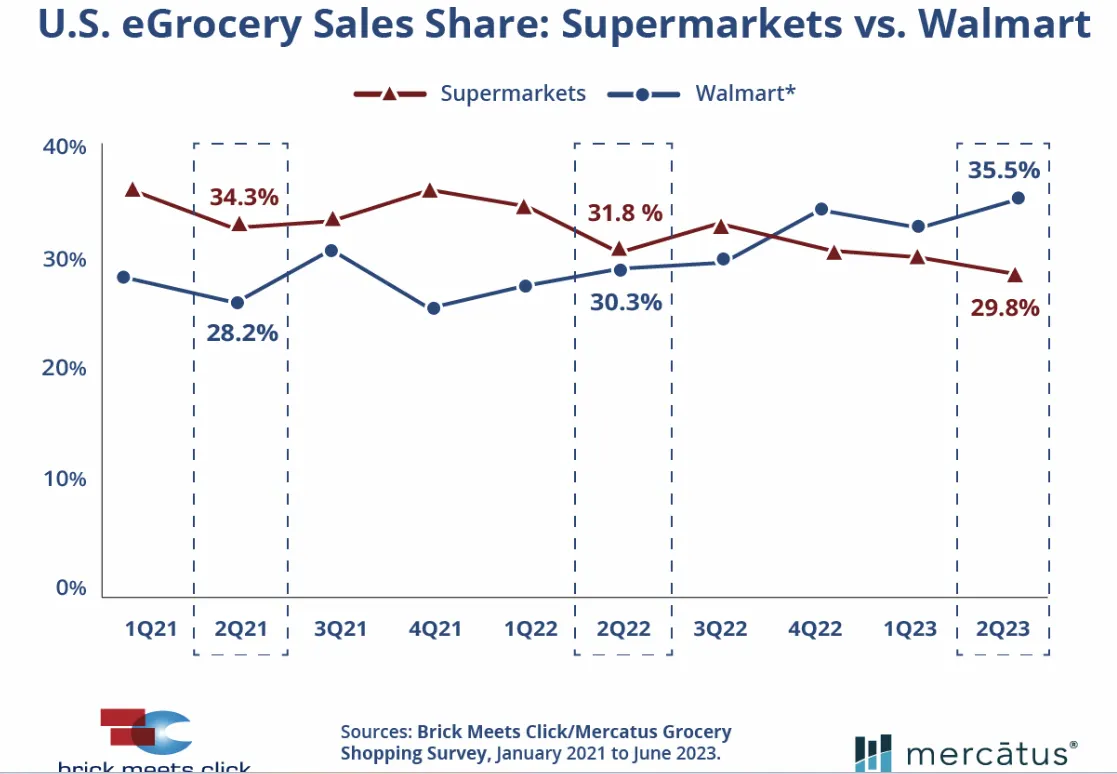 2023년 월마트(sam’s club제외히고도)는 미국내 총수퍼마켓의 eGrocery 마켓쉐어를 넘어서고 격차를 확대하고 있다