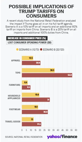 트럼프 2기 임기 시, 관세정책이 소비자 물가에 미치는 영향: 미국의 무역적자를 줄이기 위해 수입품에 10%, 중국 수입품에 60%를 부과할 경우