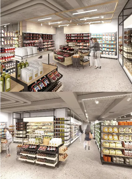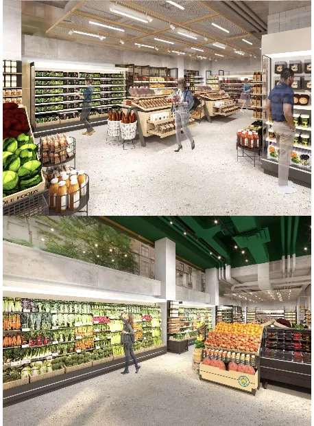 윗층에는 홀푸드마켓, 아렛층에는 아마존 그로서리를 오픈하여 이한 구조를 이루도 있다. 코카콜라 와 타이드팟 등 약 3,500개의 제품이 판매되는데, 이들 제품은 인공 성분과 첨가물에 대한 매장의 제한으로 인해 홀푸드에서는 판매되지 않습니다.