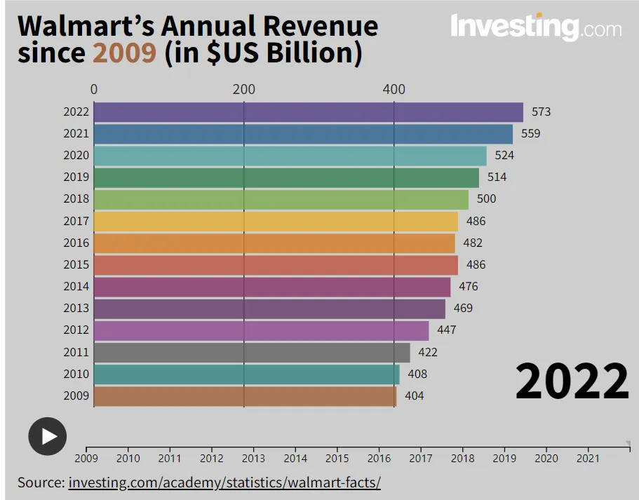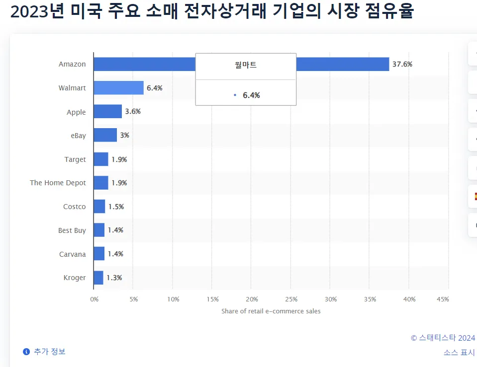 토털 미국내 전자상거래 매출 구성비는 아마존 37.6%, 월마트 6.4%. 그러나 월마트 2023회계년도 총매출액은 6,110억달러, 아마존은 5,540.2억 달러