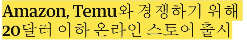 아마존의 초저가('crazy low' prices)품목 판매: Amazon launches Temu and Shein rival with 'crazy low' prices:Amazon이 가격도 똑같이 저렴한 새로운 앱을 출시. Amazon 쇼핑 앱과 모바일 웹사이트에서 이용 가능한 모바일 전용 경험인 "Amazon Haul"은 패션, 가정용품, 라이프스타일, 전자제품 및 기타 제품을 선보일 예정입니다. Amazon Haul은 사람들이 구매한 물건을 과시하는 소셜 미디어 "haul"에서 따온 이름. Amazon Haul은 Amazon 앱 내의 온라인 스토어로, Temu와 Shein과 같은 할인 매장에서 쇼핑하는 소비자를 특별히 대상으로 저렴한 품목을 판매합니다