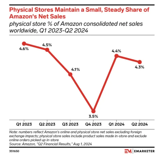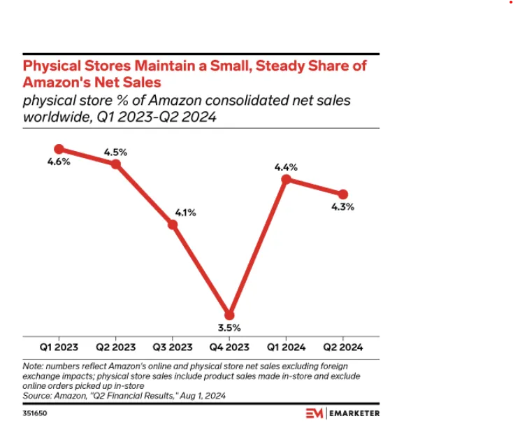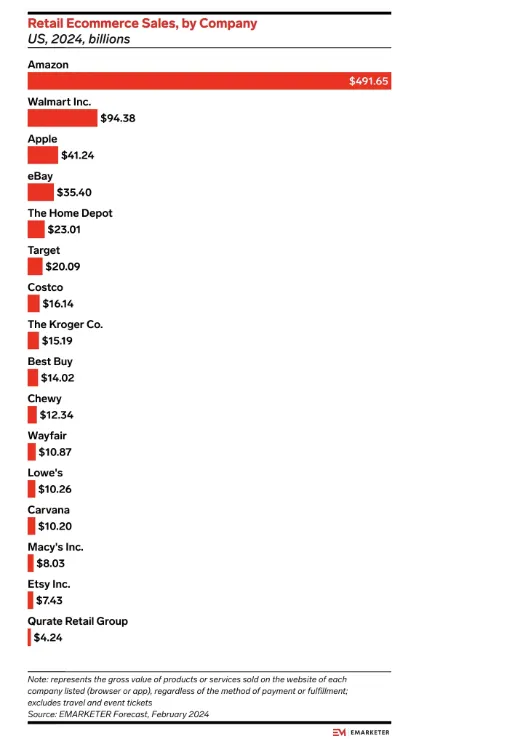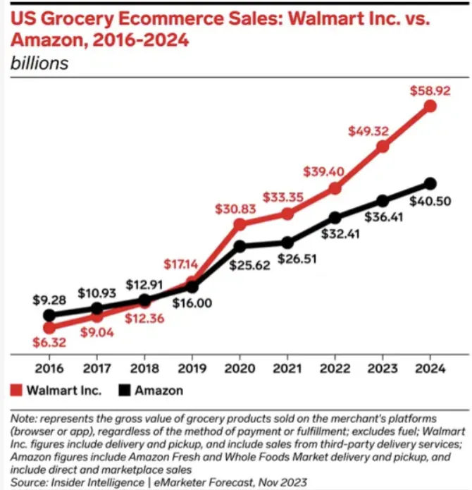 아마존이 하락하는 동안 월마트는 점유율을 높이다: Walmart 25% vs. Amazon 20%이하 예측, 격차가 점점 더 벌어지고 있다.