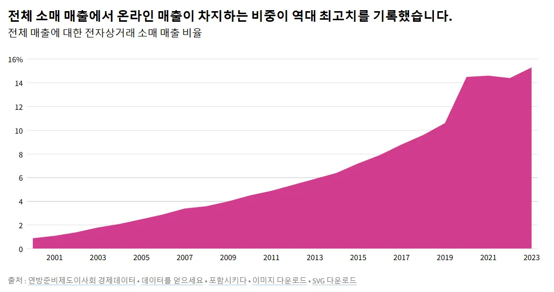 미국의 전통적인 소매점이 죽어가고 있는가? 연간 매출의 85.2%는 오프라인 매장에서 발생, 2022년 기준 소매매출의 14.8%(2021 대비 1.1%P 증가)