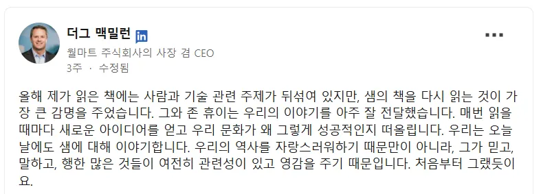 월마트 CEO의 10개의 책 추천(2024년에 세상에 미친 영향력이 있는 책): 정말로 아주 오래전에 출간된 샘월튼의 자서전이 여전히 읽어야 할 책으로 선정한 것은 의미있다. 월마트는 단순히 어떤 트렌드를 따라가거나 매출과 수익을 위해서 뭔가를 하는 것이 아닌, 샘월튼의 자서전에 나오는 월마트의 철학을 실천하는 과정이라고 생각하면 된다. 기업문화와 철학의 중요성 자체가 글로벌 기업 중에서 성공한 회사의 특징이다. 한국에서 가장 부족한 부분이 바로 이 부분이다.
