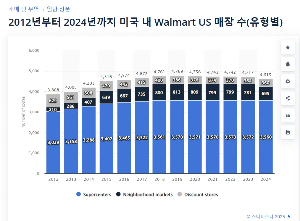 2024년 미국 월마트의 업태별 변화: 월마트 미국내 점포 수는 2019년4,756개를 정점으로 하락, 2024년은 수퍼센터 3,560개, 네이버후드 695개, 디스카운트 스토어 360개 토탈 4,756개를 기록하고 있다. 직원수(2024.3.6현재) 는 2.1백만명임. 2024년 회계연도 기준으로 식품 매출 구성비는 59.8%를 기록하여 식품 매출은 온라인 오프라인 매출에서 최고의 유통업체이다.